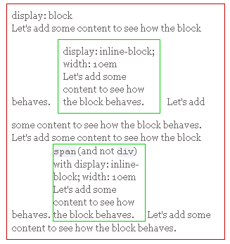 Die eigentliche Anwendung von "display: inline-block" ist, wenn für ein Inline-Element eine Breite über "width" zugewiesen werden soll. Unter bestimmten Umständen ist bei einigen Browsern die Zuweisung einer Breite auf ein echtes Inline-Element nicht möglich. Wenn aber auf die "display: inline-block" umgestellt wird, ist es möglich die Breite width mitzugeben.