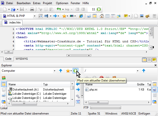 Um eine HTML-Seite, sprich Datei, online zu stellen, benötigen wir das untere Explorer-Fenster, dass mit F7 eingeblendet werden kann.